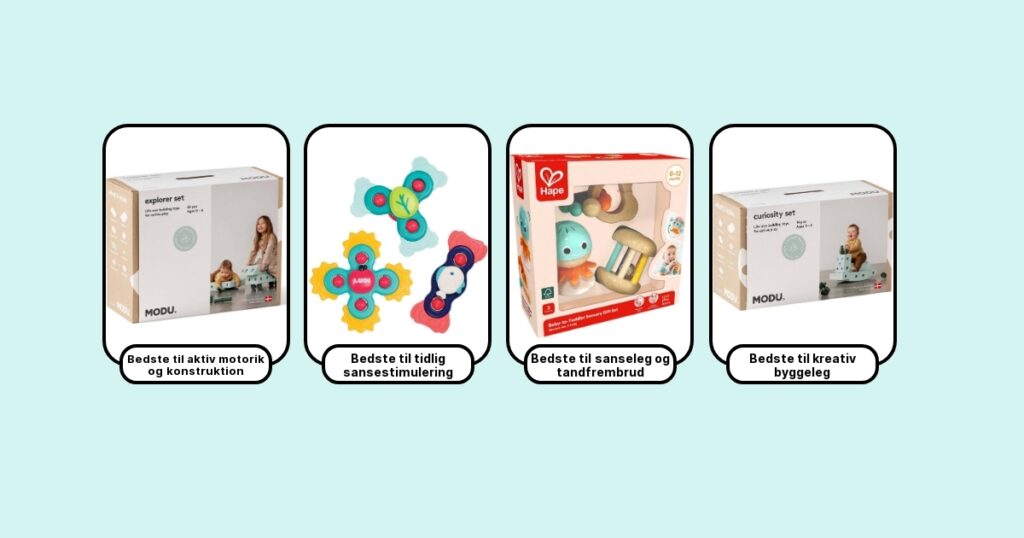 Med så mange muligheder på markedet kan det være svært at vælge. Jeg har gennemtestet utallige produkter og her er mine absolutte favoritter: aktivitetsklodser, sansetæpper, aktivitetsstativer, balancebrætter, kuglebaner, motorikbolde og stabletårne. Det, du altid skal kigge efter, er materiale af god kvalitet, alsidighed og holdbarhed. Disse typer legetøj får ikke kun børn til at lege længere – de vokser med barnet og holder til mange års brug.