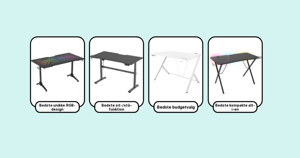 Efter at have nørdet med gaming borde i flere år, og testet alt fra budget til highend, har jeg udvalgt de syv bedste gaming borde på markedet lige nu. Jeg lægger vægt på funktionalitet, byggekvalitet, praktiske features og ikke mindst brugeranmeldelser. Listen spænder fra prisvenlige modeller med basale features, til premium-borde med alt i tilbehør. Det vigtigste er at matche bordet med dine egne behov – så lover jeg, at du får et gaming setup, som gør det sjovere at game, hver gang du sætter dig.