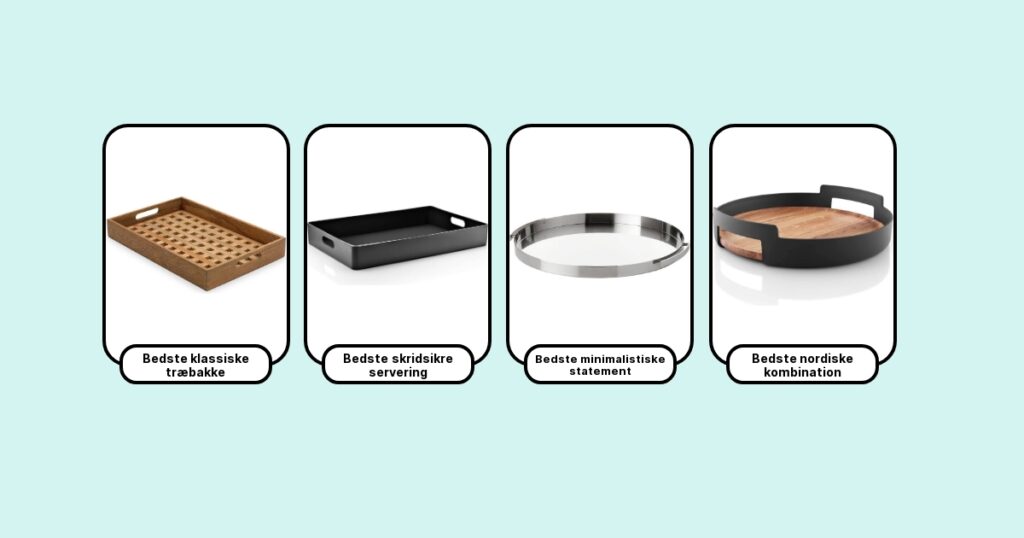 Efter at have testet og brugt utallige bakker har jeg udvalgt syv favoritter. De spænder fra den klassiske Kay Bojesen bakke i eg, som holder til alt, til Hay’s farverige bakke i stål – en moderne klassiker med wow-effekt. Jeg elsker også Zone Denmark’s runde bakker for deres praktiske kanter og flotte finish, og Skagerak har nogle af de smukkeste nordiske bakker i teak, der patinerer flot. Ferm Living laver stilrene bakker med praktiske detaljer, godt til småbørnsfamilier. Serax har elegante bakker af glas og metal til festlige stunder. Sidst men ikke mindst er IKEA’s budgetvenlige Variera-bakke overraskende solid til prisen og genial til hverdagsbrug. Hver bakke har sin styrke – og jeg ville aldrig undvære dem i mit hjem.
