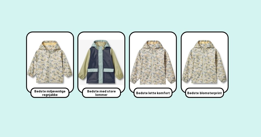 Med alt det ovenstående i tankerne, er her min liste, hvis du vil have kvalitet og funktion: 1) Helly Hansen Seven J, 2) Rains Long Jacket, 3) Patagonia Torrentshell, 4) Didriksons Thelma, 5) Fjällräven Abisko Eco-shell, 6) Marmot PreCip Eco, 7) Columbia OutDry. Jeg har testet alle modellerne i det danske vejr og kan stå inde for dem hver især, afhængigt af dit behov og budget.